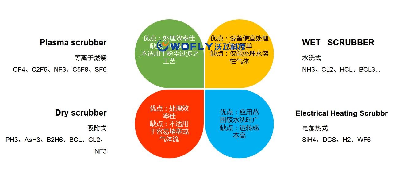 由于以上四種氣體對環(huán)境或人體皆具有一定的危害性,必須防止其直接排放大氣中,所以,一般半導體廠都以加裝大型中央廢氣處理系統(tǒng).但此系統(tǒng)僅以水洗滌廢氣.故其應(yīng)用范圍僅限于處理水溶性氣體,無法因應(yīng)日新月異且分工細微的半導體工藝廢氣.因此必須依據(jù)各工藝所衍生出的氣體特性種類,選擇搭配相對應(yīng)的廢氣處理設(shè)備,才能有效解決廢氣問題.而由于工作區(qū)域多半離中央廢氣處理系統(tǒng)前,常因氣體特性導致管路中結(jié)晶或粉塵堆積,造成管路堵塞后導致氣體泄漏,嚴重者甚至引起爆炸,無法確?,F(xiàn)場工作人員之工作安全.因此在工作區(qū)域需配置適合工藝氣體特性的小型廢氣處理設(shè)備(Local Scrubber),以減少在工作區(qū)域滯留的廢氣,確保人員安全。