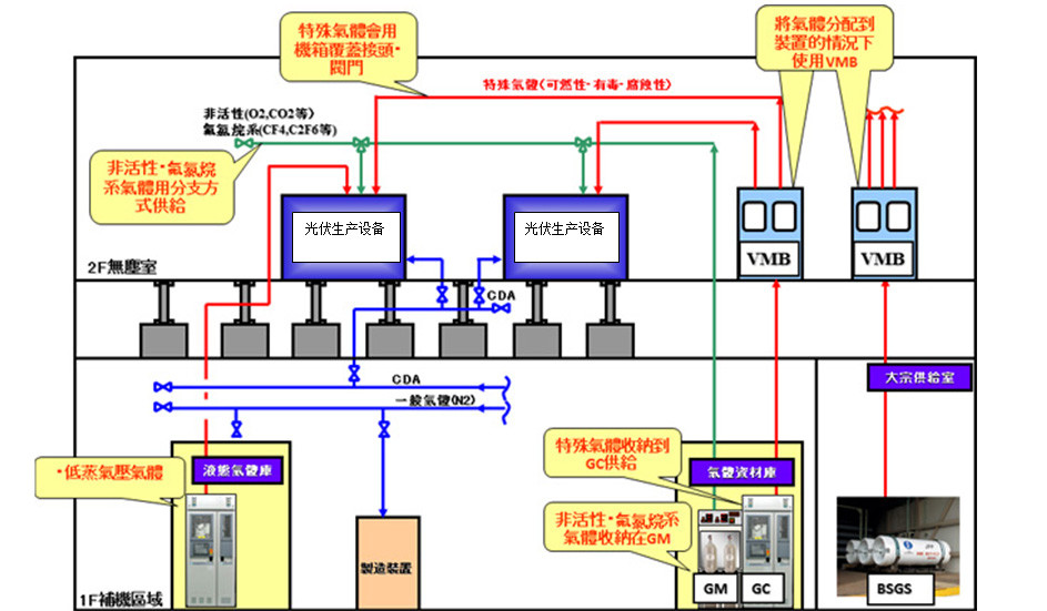 特種氣體是光電子、微電子等領(lǐng)域,特別是超大規(guī)模集成電路、液晶顯示器件、非晶硅薄膜太陽能電池、半導(dǎo)體發(fā)光器件和半導(dǎo)體材料制造過程不可缺少的基礎(chǔ)性支撐源材料。它的純度和潔凈度直接影響到光電子、微電子元器件的質(zhì)量、集成度、特定技術(shù)指標(biāo)和成品率,并從根本上制約著電路和器件的精確性和準(zhǔn)確性。沃飛科技提供太陽能光伏工廠所使用的高純度氣體(O2/Ar/N/H2/He等)、特氣(SiH4/GeH4/PH3/AsH3/SbH3/B2H6/BF3/NF3/PF3/PF5/CF5/CF4/C2H6/C3F8等)綜合供氣系統(tǒng);排氣處理、監(jiān)視系統(tǒng)的綜合管理系統(tǒng);建立以安全為第一的特氣管理輸送系統(tǒng)。從設(shè)計(jì)、選型、制造、安裝、測試、調(diào)試和系統(tǒng)托管服務(wù)
