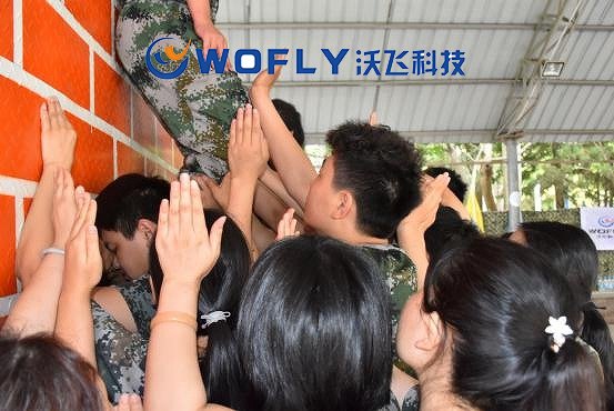 團(tuán)建的壓軸項(xiàng)目是翻越一面4.3米高的“畢業(yè)墻”,無任何輔助道具,無任何外力幫助,只憑借單槍匹馬,是不可能爬上去的,想要過去的唯一途徑依靠于沃飛30人的團(tuán)隊(duì)力量。在這個(gè)過程中,沃飛團(tuán)隊(duì)就像一個(gè)大家庭,無論男生女生,都貢獻(xiàn)著自己的力量,搭建人梯、群力托舉,伙伴們有力的肩膀,一雙雙托舉的手,一張張憋足了勁而漲紅的臉,每個(gè)人都在借助身邊人的力量向上爬,也在拼盡全力幫助其他小伙伴登上墻頂。