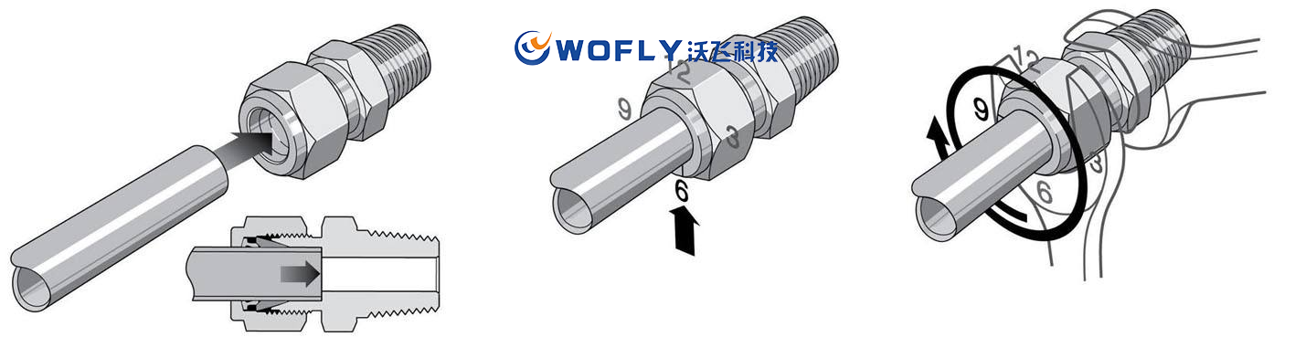 如圖所示,下面這就是卡套式管接頭,卡套式管接頭具有結(jié)構(gòu)簡單、使用方便和不用焊接等優(yōu)點(diǎn),在化工,制藥,石油,科學(xué)實(shí)驗(yàn),電氣工程等諸多行業(yè)中廣泛應(yīng)用,通過外表觀察可以發(fā)現(xiàn),卡套式管接頭由三部分組成:接頭體、卡套、螺母。安裝方法非常簡單,當(dāng)卡套和螺母套在鋼管上插入接頭體后,旋緊螺母時,卡套前端外側(cè)與接頭體錐面貼合,內(nèi)刃均勻地咬入無縫鋼管,形成有效密封。但是我們在安裝的時候需要注意一些事項(xiàng),沃飛科技小編為您介紹一下卡套式接頭如何安裝及安裝注意事項(xiàng)。