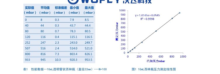 采用填充氮?dú)鈮毫?、40、80、120、253、507、800和933 mbar的一組壓力標(biāo) 準(zhǔn)評(píng)估用于測(cè)定總頂空壓力的系統(tǒng)性能。通過(guò)直徑為22mm的10mL西林瓶建立這些標(biāo) 準(zhǔn)。使用FMS-1400頂空水汽/真空度測(cè)試儀測(cè)定每種標(biāo)準(zhǔn)100次。FMS-1400頂空水汽/真 空度測(cè)試儀測(cè)定容器頂空中水蒸氣分子的激光吸收量。吸收信號(hào)寬度與氮?dú)鈮毫ο嚓P(guān)。根 據(jù)測(cè)得數(shù)據(jù)確定平均濃度、標(biāo)準(zhǔn)偏差、最大讀數(shù)和最小讀數(shù),這些數(shù)據(jù)如表1所示。圖1所示 為表1中壓力數(shù)據(jù)的線性圖。