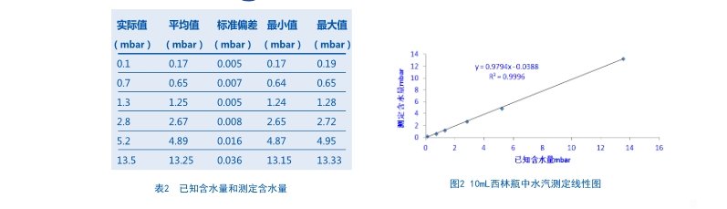 使用填充水蒸汽壓力為0.1、0.7、1.3、2.8、5.2、13.5mbar的一組水汽標(biāo)準(zhǔn)物質(zhì)評(píng)估用于測(cè)定水蒸氣壓力的系統(tǒng)性能。通過(guò)直徑為 22mm的10mL西林瓶建立這些標(biāo)準(zhǔn)。使用FMS-1400水汽/真空度測(cè)試儀測(cè)量每種標(biāo)準(zhǔn)物質(zhì)100次。FMS-1400水汽/真空度測(cè)試儀測(cè)量容器頂空中水蒸汽分子激光吸收量。吸收信號(hào)振幅與頂空水汽汽濃度成比例。根據(jù)測(cè)得的數(shù)據(jù)集確定平均濃度、標(biāo)準(zhǔn)偏差、最大讀數(shù)和最小讀數(shù),這些數(shù)據(jù)如表2所示。圖2所示為表2中水分濃度數(shù)據(jù)線性圖。這種測(cè)定的無(wú)損特性使得我們可以建立系統(tǒng)性能的全面統(tǒng)計(jì)文檔。從應(yīng)用的觀點(diǎn)來(lái)看,采用無(wú)損測(cè)量可以在同一個(gè)樣品上隨著時(shí)間進(jìn)行多次測(cè)定(例如在整個(gè)貨架期內(nèi)進(jìn)行多次測(cè)定),并且進(jìn)行全面的批量分析可幫助客戶深入了解工藝的變化和對(duì)應(yīng)的優(yōu)化措施。