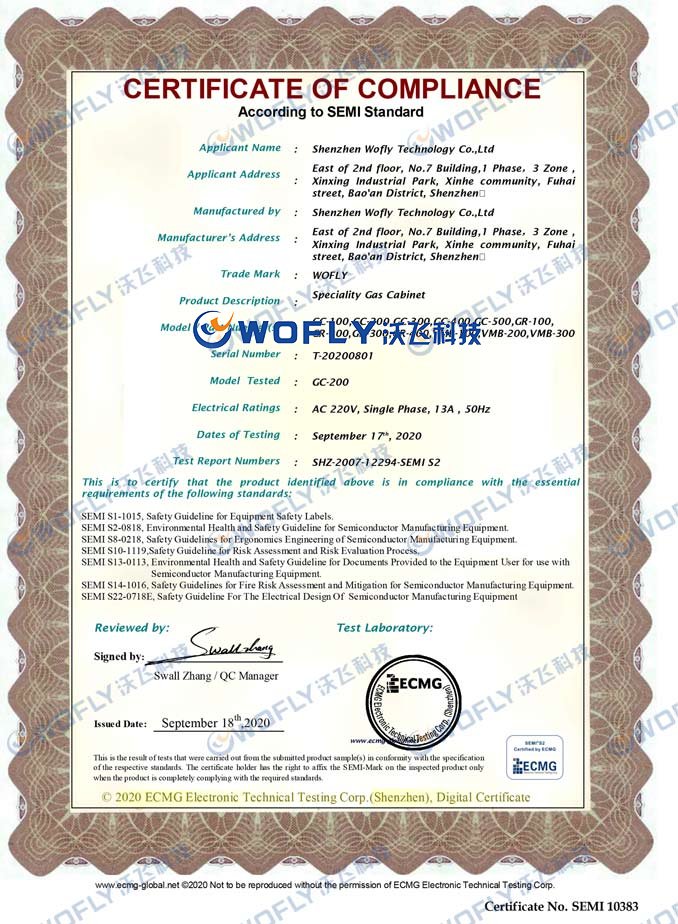因特種氣體的特殊性,承載特種氣體的氣瓶柜體須為防爆柜體,同時為保證半導(dǎo)體制程工藝中特種氣體的穩(wěn)定供氣和安全,應(yīng)具備多種功能,如柜內(nèi)氣體泄漏偵測報警、PLC面板控制、全自動吹掃等,提高使用安全系數(shù),有效的保護生產(chǎn)安全和人員的生命安全。其次,半導(dǎo)體行業(yè)配置電子特氣柜需要擁有SEMI S2認(rèn)證。